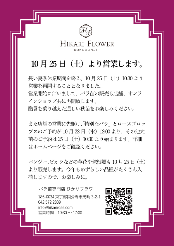 大苗のご予約、秋苗の販売は、店舗の営業と同様、10月25日(土)10:30から、